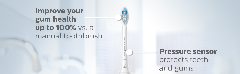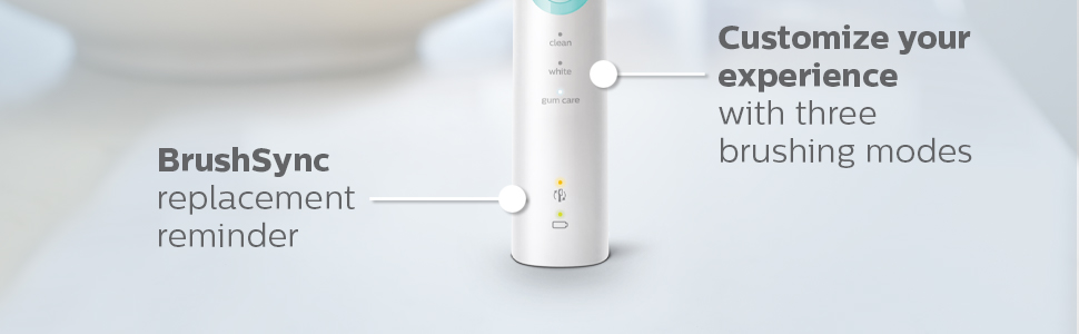 Improve your gum health up to 100% better than a manual toothbrush with the Philips Sonicare ProtectiveClean 5100 rechargeable electric toothbrush. It has a pressure sensor that protects teeth and gums from excess brushing pressure. Brush heads wear out over time. Our BrushSync technology tracks how long you have been using your Optimal Gum Care brush head and how hard you have been brushing. Your electric toothbrush will beep to inform you when to replace your brush head. Customize your own brushing experience with your choice of 3 modes: Clean, White and Gum Care. The easy-start feature slowly increases the power of the brush as you get used to the Sonicare experience and the SmarTimer encourages a full 2 minutes brushing time as recommended by your dental professional. The battery charge indicator light lets you know when it is time recharge; 2 week battery life. The kit includes 1 White ProtectiveClean 5100 handle, 1 Optimal Gum Care brush head, 1 white charger, 1 white travel case. Subscribe & Save on genuine Philips Sonicare brush head replacements and save up to 15%.