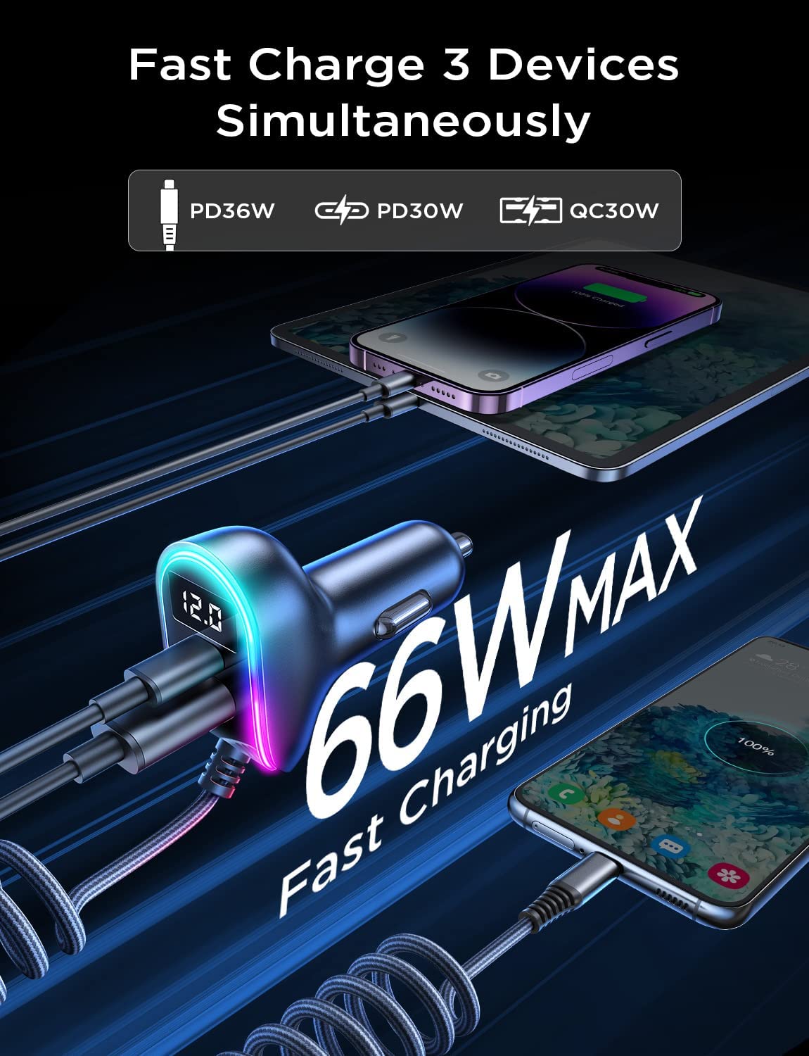 USB C Car Charger Adapter - LISEN 66W 3 Port USB Car Charger Fast Charging Dual PD&QC3.0 with 5.3ft Fast Charge Type C Car Charger Compatible with Samsung Galaxy S22 S21 Note 20 Pixel iPad Pro iPhone