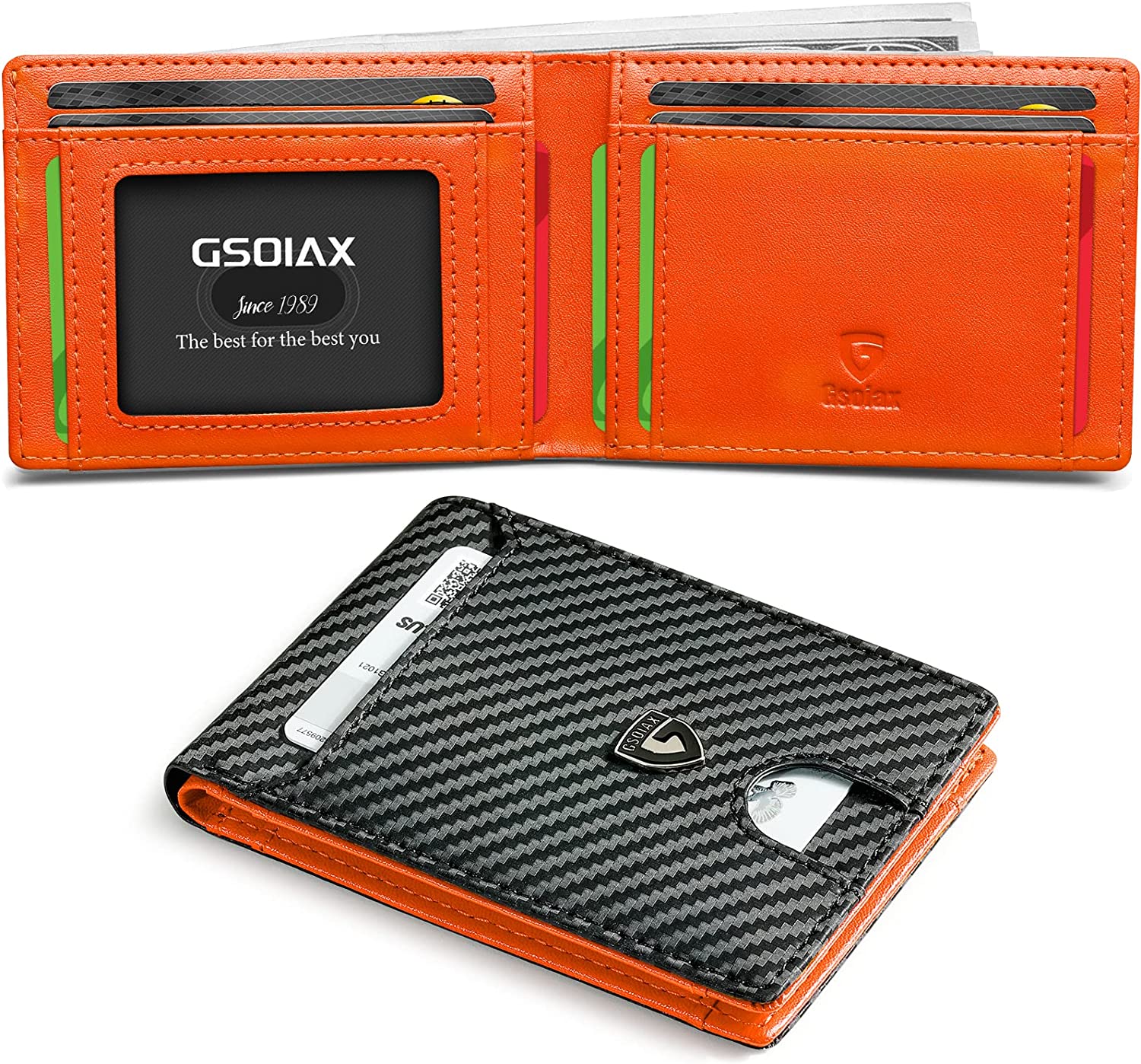 GSOIAX Mens Slim Wallet RFID Blocking Bifold Carbon Fiber Thin wallets for men Minimalist Genuine Leather Card Holder Money Clip with Gift Box (Carbon Black and Red)