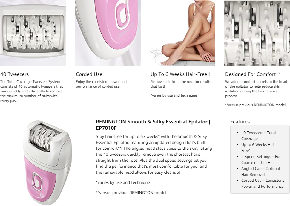 Stay hair-free for up to six weeks* with the Smooth & Silky Essential Epilator, featuring an updated design that’s built for comfort**! The angled head stays close to the skin, letting the 40 tweezers quickly remove even the shortest hairs straight from the root. Plus the dual speed settings let you find the performance that's most comfortable for you, and the removable head allows for easy cleanup! *varies by use and technique **versus previous REMINGTON model.