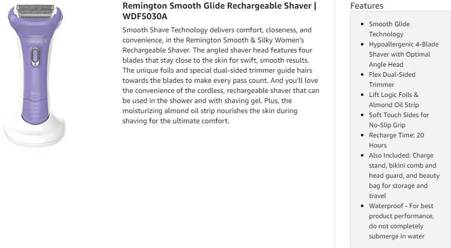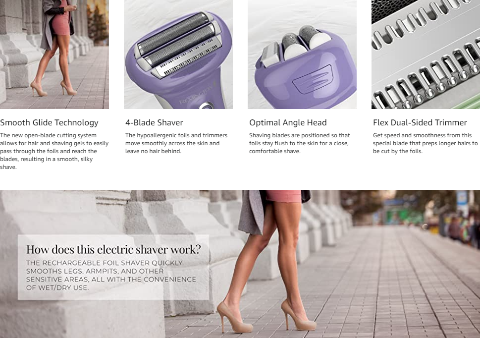 Smooth Shave Technology delivers comfort, closeness, and convenience, in the Remington Smooth & Silky Women’s Rechargeable Shaver. The angled shaver head features four blades that stay close to the skin for swift, smooth results. The unique foils and special dual-sided trimmer guide hairs towards the blades to make every pass count. And you’ll love the convenience of the cordless, rechargeable shaver that can be used in the shower and with shaving gel. Plus, the moisturizing almond oil strip nourishes the skin during shaving for the ultimate comfort.