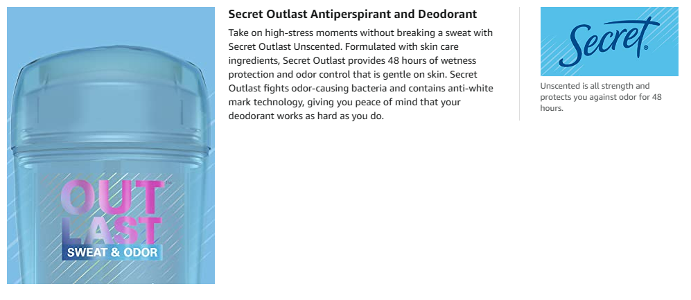 Sweat is the last thing you need to be worried about. Take one worry off of your plate first thing in the morning. With a couple quick swipes, you'll have confidence all day. Secret Outlast fights sweat better* so you get all strength and no sweat for 48 hours. Clear Gel goes on clear for no white marks. When you use Secret, you're getting the peace of mind that your deodorant will work as hard as you do. *Vs. Leading invisible solid