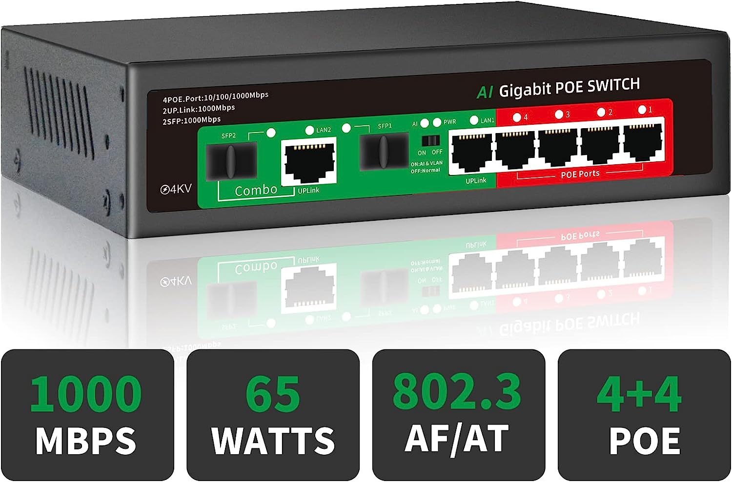 STEAMEMO switch is an unmanaged 4-Port Power over Ethernet Switch with a total of 52 watts of PoE power. All ports run at 10/100Mbps and can provide up to 30W per port through the IEEE 802. 3af/at standard.
