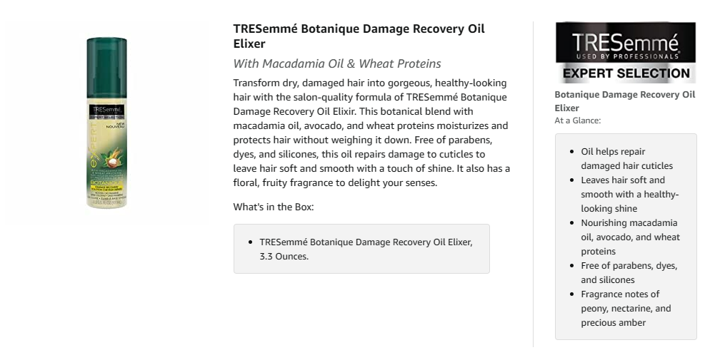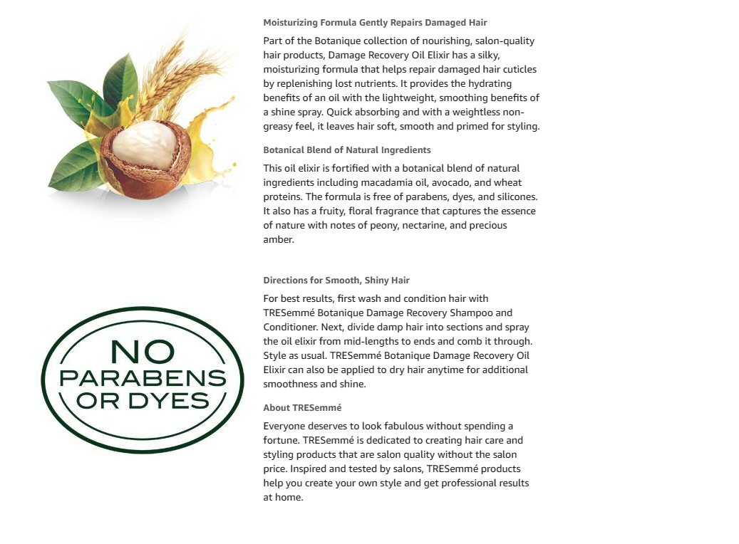We love the ingredient trend too. So we found a way to marry rich botanical ingredients and our professional quality formulas Get head-turning hair with the TRESemmé BOTANIQUE collection. Our professional-quality formulas, with botanical blends, are free from parabens and dyes and will bring out your hair's natural beauty. Infused with macadamia oil, wheat proteins and avocado, the TRESemmé BOTANIQUE Damage Recovery Oil Elixir combines the nourishing and smoothing benefits of an oil with the weightlessness of a shine spray. The TRESemmé BOTANIQUE Damage Recovery Oil Elixir repairs rough cuticles to make hair look smooth, healthy and glossy. This intensive leave-in treatment has a light texture that won't leave hair greasy.