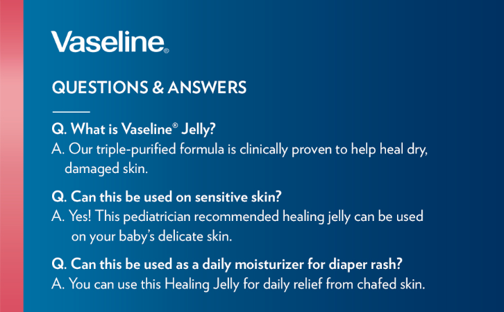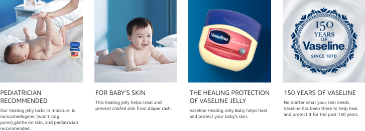 Vaseline Jelly Baby is ideal for all of your baby's skin needs. Use it to heal dry skin, protect minor cuts, and reduce diaper rash. It is made from 100 percent pure triple purified petroleum jelly, and contains no irritants and is hypo-allergenic. The jelly is also non-comedogenic, so it will not block pores.